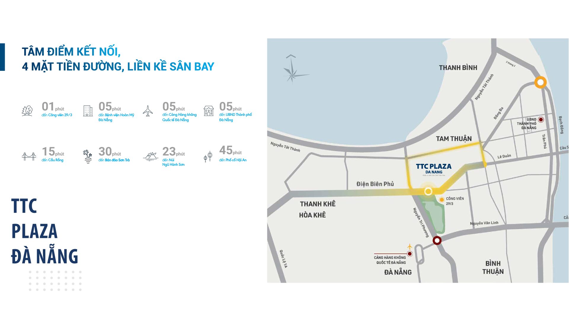 Tọa lạc trên mặt tiền Nguyễn Tất Thành – trục ven biển huyết mạch, TTC Plaza Đà Nẵng kết nối nhanh chóng đến:
