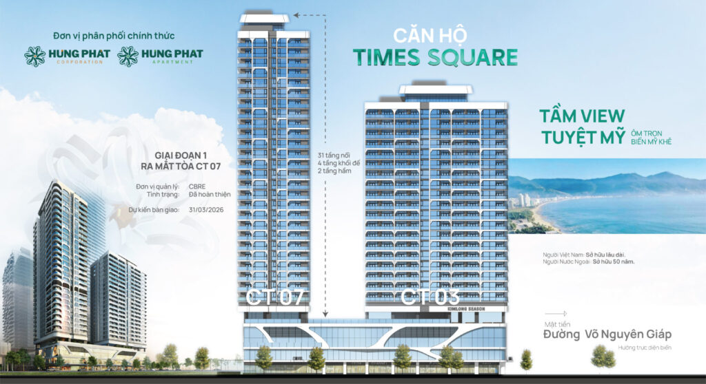 Tòa tháp CT7 (Tower B) là trái tim của dự án Căn Hộ Times Square – FUTA Residence, vươn cao 31 tầng kiêu hãnh giữa “cung đường tỷ đô” Võ Nguyên Giáp. Với 295 căn hộ tiêu chuẩn , mỗi căn hộ Times Square tại đây không chỉ là một nơi ở, mà là một tác phẩm của ánh sáng và cảm xúc, được “may đo” tinh tế bởi các thương hiệu nội thất danh tiếng toàn cầu. Bài viết này sẽ đi sâu vào mặt bằng chi tiết và tiêu chuẩn bàn giao vật liệu cao cấp, vốn làm nên giá trị thực của dự án.
