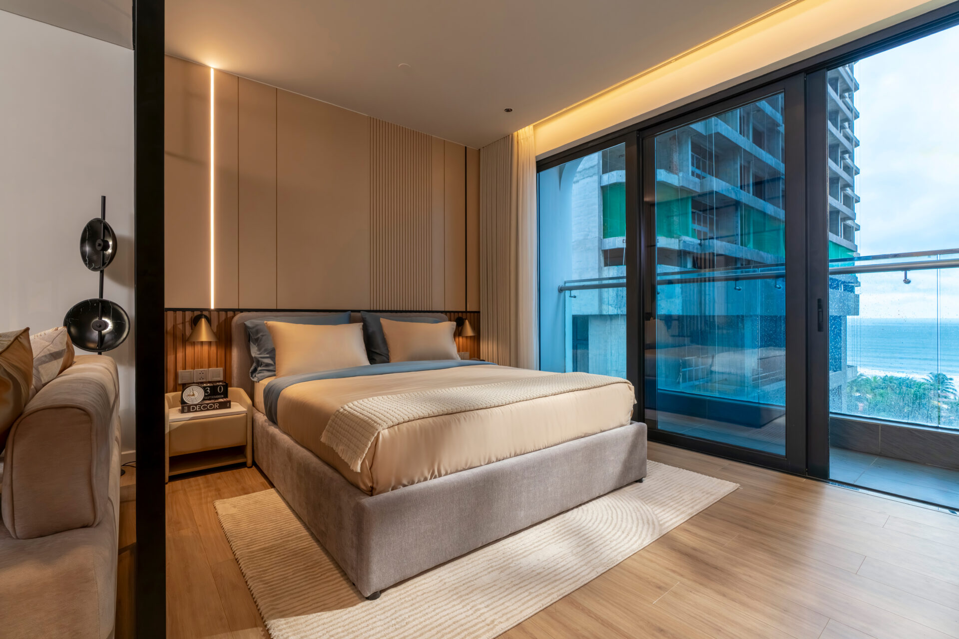 - Phân tích: Đây là lựa chọn lý tưởng cho các gia đình nhỏ an cư hoặc nhóm du khách gia đình. Thiết kế 2 phòng ngủ, 2 vệ sinh đảm bảo công năng sử dụng. Đặc biệt, ban công rộng 11m mang đến không gian sinh hoạt chung ngoài trời tuyệt vời, ôm trọn view biển Mỹ Khê.